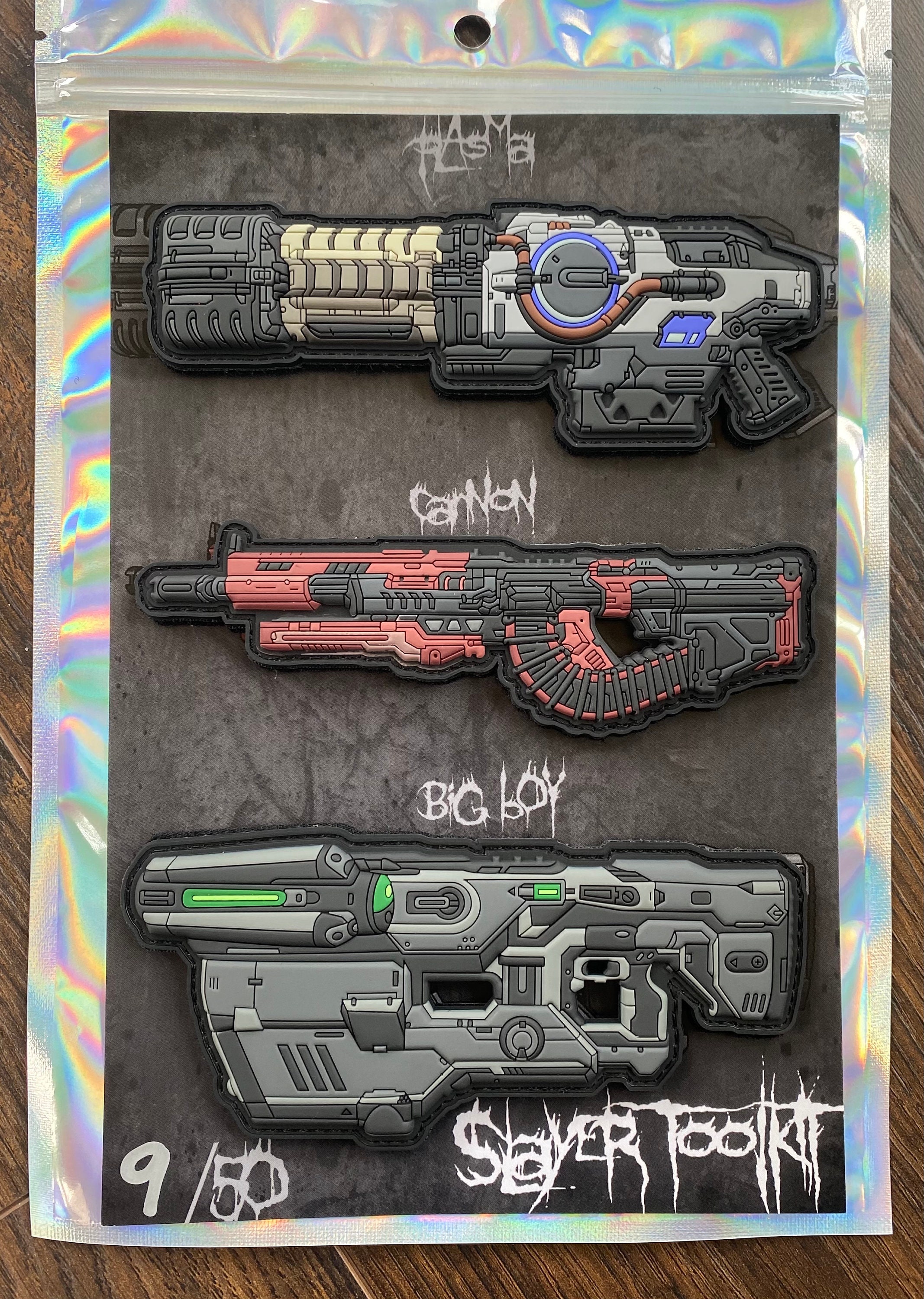 Project Manticore and @tacticool_doodles present The Slayer Toolkit. This special edition kit comes with 3x 5.5" Velcro-backed PVC patches - Plasma, Cannon, and Big Boy - along with serialized card art featuring the original patch artwork and a Project Manticore vinyl dye cut sticker.